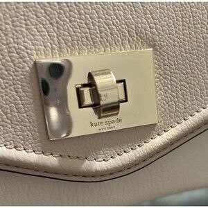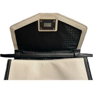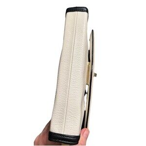 This is a Kate Spade Walter Place Nikki Walter place envelope crossbody bag in cream, white, and black colors with gold hardware. It features a turn lock closure, a removable black adjustable leather strap, and a black lining. The bag is made of leather and has dimensions of 8.5" width, 6" height, and 1.5" depth. In beautiful preowned condition. Please note a bit of a wear on the front gold piece as pictured.
