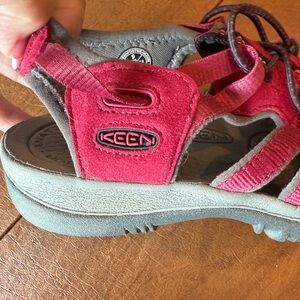 Purchased these sandals for a trip that I did not end up taking and did not return them timely. Never worn. KEEN is reknowned for its comfortable sandals. This pair is a beautiful shade of red with black trim, the stock photos are for illustration only and appear slightly different in the stock photos than the pair for sale.