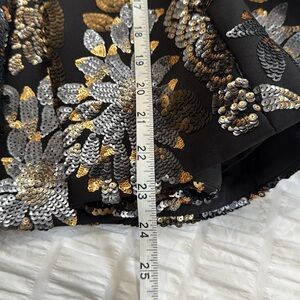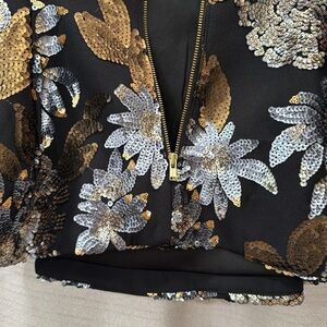 Urban Outfitters peplum top with a striking black,gold and silver floral sequin design. Weighty structured look. Zip back closure. The embellished details and tailored fit , excellent quality, looks high end.