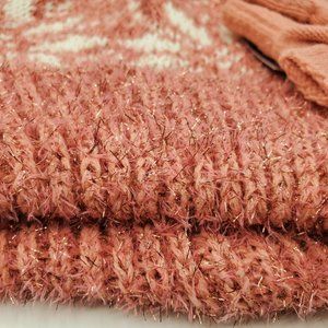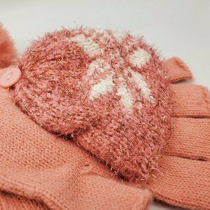 New with tag pink faux fur hat and glove set with two top pom pom's and pink metallic threads. Finger less glove with matching mitten tops. Kids one size.