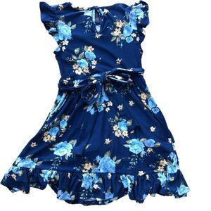Beautiful stretchy flowered dress. Stretchy material. Ruffled short sleeve, double ruffled skirt. Belt. One button open back.