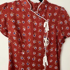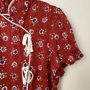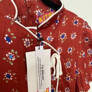 KITRI Harlow mini dress. Cheongsam inspired dress with mandarin collar made from their Ecovero Viscose blend. Stunning burnt red/orange with floral pattern and tie detailing. Looks almost western to me. Easy day to night dress. US 2 / UK 6 / XS. The last photo is just to show the way the dress looks on person, it isnt the exact same pattern/color.