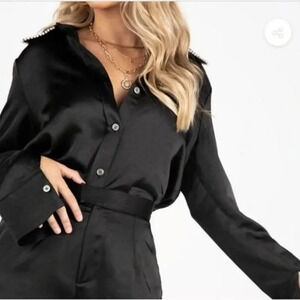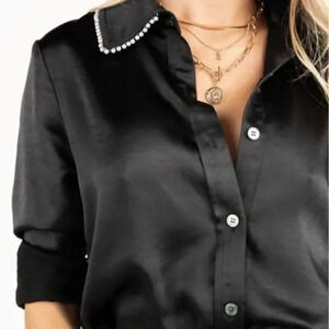 NWT KITTENISH | Black Satin Pearl Embellished Button Down | XS