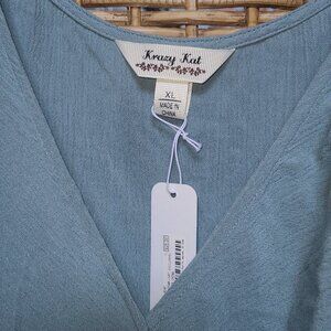Effortlessly elevate your wardrobe with the Krazy Kat Mint Seafoam Blue Tunic Blouse, a versatile piece that transcends occasions from business to casual, and even to cocktail parties. The sleeveless design in a comfortable XL fits the classic silhouette, making it an easy match for your favorite bottoms. Its lightweight rayon fabric ensures breathability and ease of movement, while the solid color maintains a polished, professional look.The blouse features a flattering cross over V-neck which creates a large pocket on the front. Unique high-low hem that adds a touch of bohemian flair. The easy care attribute means it's machine washable, ensuring this piece remains a fuss-free addition to your collection. Whether layered under a blazer or worn alone, it seamlessly fits the bill for any season and setting. Size XL that measures 24" across the front at the underarms. Total length down the center of the back is 30". New with tags.