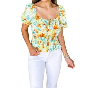 DETAILS: Short sleeve. Square neck. Tie detail. Puff sleeves. Floral patterns. Pull on. 100% Lyocell.