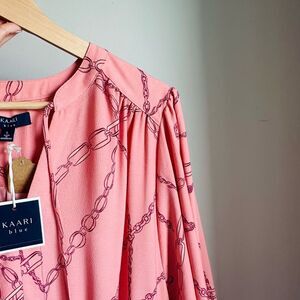 The NWT Kaari Blue London Calling Blush Chain Long Sleeve Blouson Mini Dress is where femme style meets French luxe vibes.
