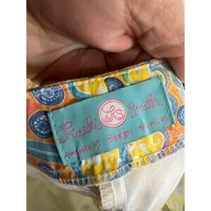 New with tags Kaeli Smith size 10 colorful cropped pants. Good stretch to them. Yellow, blue, green and orange. Waist is 16 1/2” across. Inseam is 25” and rise is 9”.