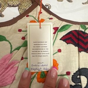 NWT Kage hand embroidered tote bag with leather trim. Never worn. Looks like the leather bled a little in a few spots but barely noticeable (see photos). Great for summer. Or vacation.spotless interior