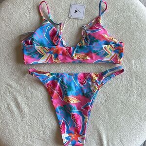 NWT Kamoni Pink Floral V Neck Tie Front High Leg Cut Mid Cheeky Bikini Large