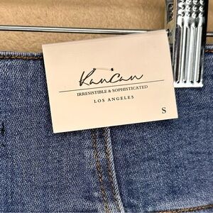 This stylish mini denim skirt by KanCan is perfect for casual settings. Featuring a chic tie front design, it offers a sleek silhouette in a rich blue hue. The skirt's modern cut ensures a fashionable and versatile addition to any wardrobe. Fabric has stretch. New with tags. Never worn.