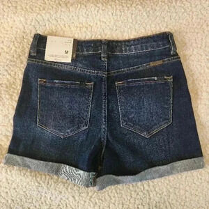 These stylish dark blue denim jean shorts by KanCan feature a rolled hem and classic 5-pocket design, making them perfect for casual wear. The shorts are versatile and comfortable, making them a great addition to any wardrobe.