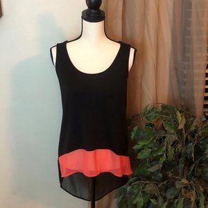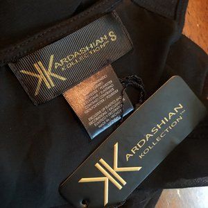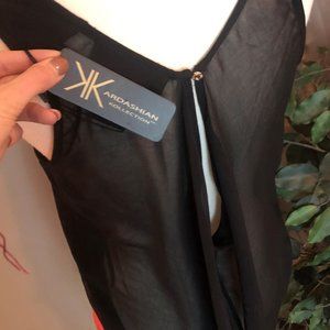 A red trim accents the front of the top while a sheer back drapes loosely from a sexy buttoned keyhole between the shoulder blades.