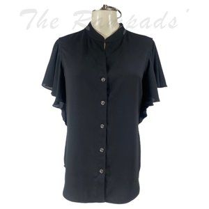 Brand NEW, tags attached. Karen Kane solid black curtain design short-sleeve blouse. Button-down. Size small!