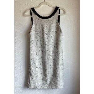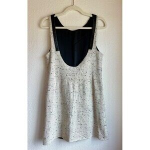A gorgeous wool tweed mini shift dress with leather accents and a low back. The wool tweed is a creamy white with black specks throughout, coordinating perfectly with the black leather accents. A classic dress that can be styled casual or dressy.