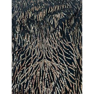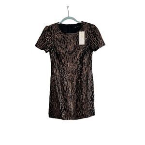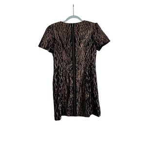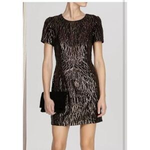 Dazzling black with gold and bronze sequins all around, round neck, short sleeves, mini dress.