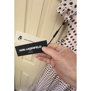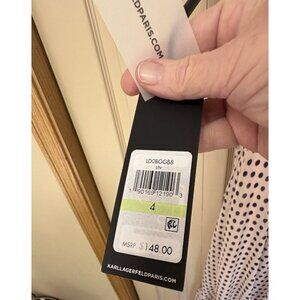 The NWT Karl Lagerfeld Paris Pink Black Polka Dot Ruffle Midi Dress in size 4 is a stylish and elegant choice for women. This dress features a flattering V-neckline, short sleeves, and a fun polka dot pattern with colorful accents from the ruffle detailing. Made from a comfortable polyester blend, this sheath dress is perfect for a Parisian-inspired theme, making it a chic and trendy option for any occasion.