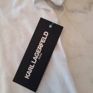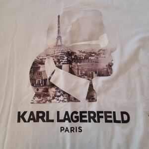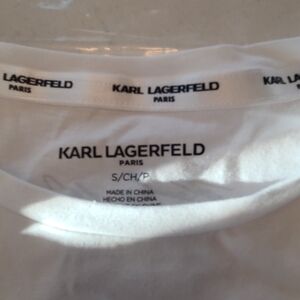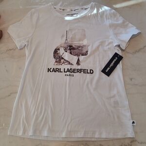 NWT Karl Lagerfeld Paris White T-Shirt in Various Sizes. This is a great shirt that retails for 49 dollars. It is in new condition. Stylish white graphic t-shirt featuring Karl Lagerfeld design. Perfect for casual wear.