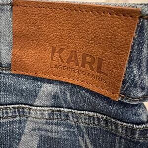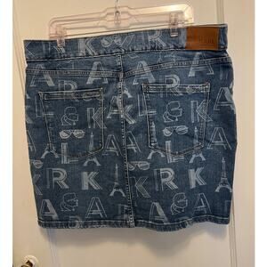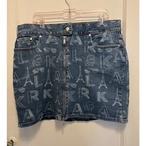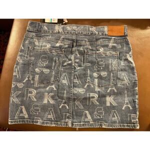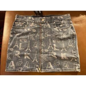New Karl Lagerfeld signature print denim mini skirt with a two-way zipper with button top closure. Fun.