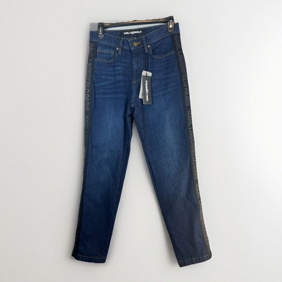NWT Karl Lagerfeld Women Straight Leg Logo Black Tape Blue Jeans Size 2 $99.50