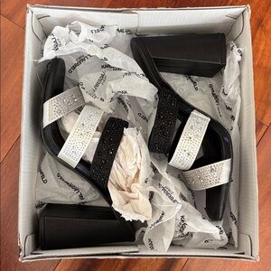 Gorgeous rhinestone embellished Karl Lagerfeld strappy heels with block heel. New in box never worn.