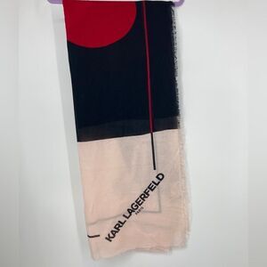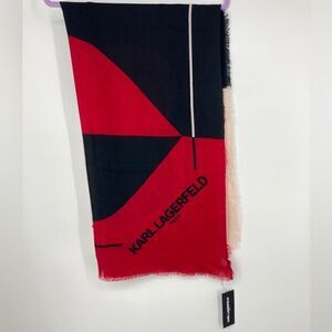 NWT Karl Lagerfeld Paris Big Chic Multicolor (white/Red/Black) Scarf with Logo Approximately Measurement: 53"/57" 91% Modal 9% Wool Before the photo shoot I melted the label a little with an iron.It's mostly cut off.Please see last picture.I think it's up to you whetler to keep it or not. CA#57151