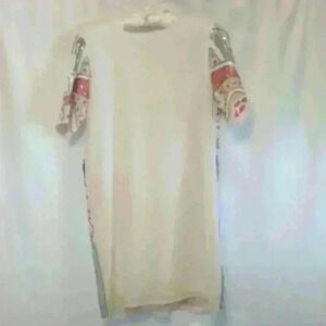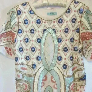 I have such remorse that this Karlie NWT beautiful dress is a little too tight for me. I'm a true medium and this is a S/M. Gorgeous pattern with sequins in coral, blues, white and gold. PTP 18.25. Length 33.5. Comes with extra sequins but I do not see any missing. Excellent condition.