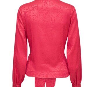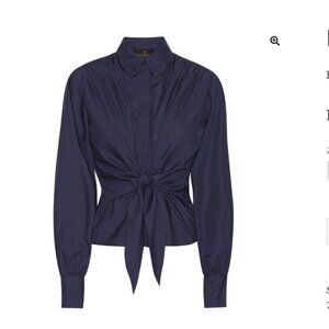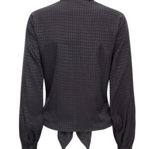 The Lee Shirt has an elegant tie band closure in the front of the shirt to highlight the waist. The shirt has long sleeves, a classic collar and button closures on the front of the shirt and on the sleeves.