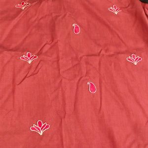 Pretty gold embroidery against a deep red/maroon background. Sheer black sleeves and velvet accent at the front hem. Very nice and lightweight fabric.