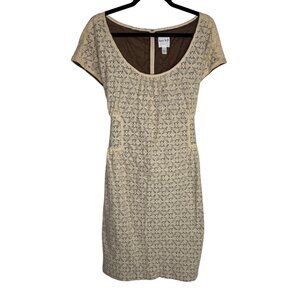 Keywords: lace dress, brown bow detail, formal dress, semi-formal, cap sleeve dress, scoop neck dress, cotton blend dress, Kate Hill dress, petite size dress, back zipper dress, women's clothing, neutral dress, elegant outfit