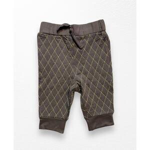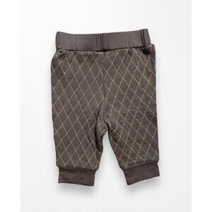 New with tags quilted bamboo joggers from Kate Quinn, fits babies 3-6 months. Chocolate brown with gold stitching, elastic waistband with decorative drawstring bow, cuffed. 96% viscose from bamboo/4% Lycra.