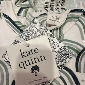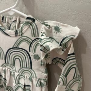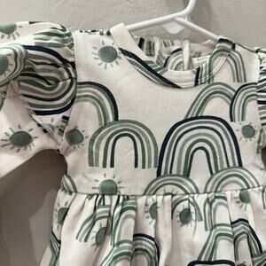 Kate Quinn long sleeve dress size 6-12 months. Sea Pine Blue Rainbow colorway has a cream background with suns and rainbows and ruffles on shoulders. New with tag (NWT), new in bag (NIB).