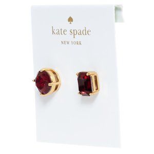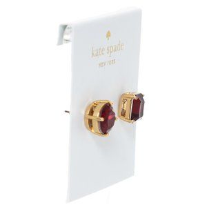 Mismatched earrings (1 circle, 1 rectangle), yellow gold-tone plated metal, plastic circular backs, reddish cherry crystal stone, genuine dust pouch included. Brand new, never worn. Opened bag only to photograph. Purchased from Kate Spade store 2-3 years ago for Christmas stocking stuffer - this is an extra set I never gifted.