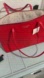 Materials: Bright red crossgrain leather on exterior. Fully lined with fabric interior.