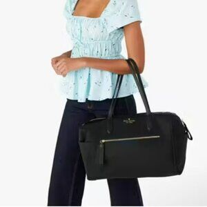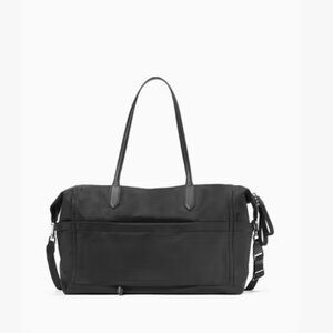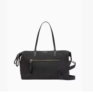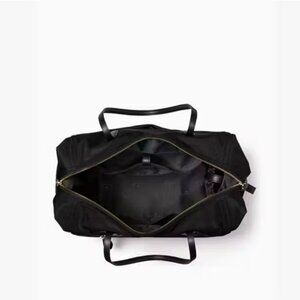 The NWT Kate Spade Chelsea Large Nylon Weekender Travel Bag in Black is a stylish and functional travel bag designed for women on the go. With a solid black exterior and double black handles, this bag is perfect for weekend getaways or everyday travel. The interior features inner pockets and a zip closure for added security. The Kate Spade Chelsea collection combines fashion and functionality, making this weekender bag a must-have for any fashionable traveler. Style Number KC525 Measurements Height: 11.0" Width: 8.6" 17.7"L at Top, 16.1"L at Bottom Materials 100% recycled nylon Trim: Smooth PVC trim Handle Handle drop: 8.6" Strap Strap drop: 22" when buckled at center hole - detachable Features Exterior back zip pocket Interior front slip pocket, interior back zip pocket, interior front credit card slots KSCNW-1612