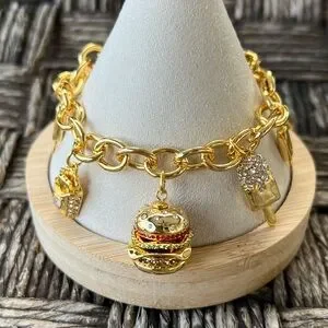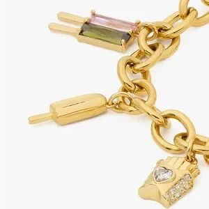 Playful gold-tone charm bracelet with assorted food and crystal-accented charms. Lobster clasp and adjustable chain. Cute statement accessory. Sold out online.