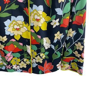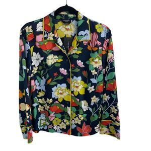 • Features: Long sleeve, Button up front, Collared, Polyester, Navy blue with multicolor flora print all over, Never worn