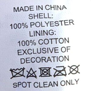Materials: Shell: 100% Polyester, Lining: 100% Cotton exclusive of decoration