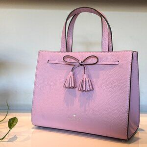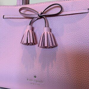 Brand new, never worn Kate Spade bag with tag on. Pretty pink, pebbled leather purse with tasseled bow. Includes removable/adjustable shoulder strap. Open top satchel with middle zip compartment. Bag is about 10" wide and 8" tall (not including the straps).