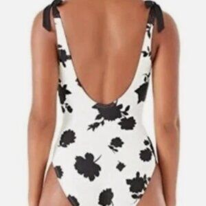 Fun in floral! Super cute ivory and black floral one piece swimsuit from Kate Spade. Pull-on styling with adjustable shoulder ties for the perfect fit. V-front with removable soft cup padding, moderate bottom coverage and fully lined. Nylon/Spandex blend, feel free to message with any questions. Thank you for shopping with us and have a great day!