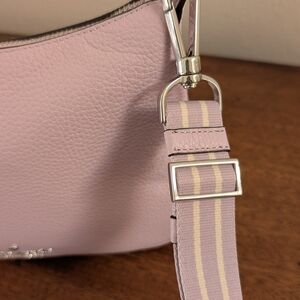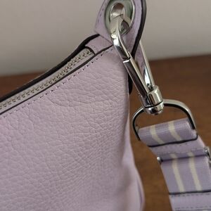 Kate Spade lavender leather crossbody bag with adjustable cloth strap.