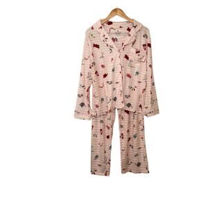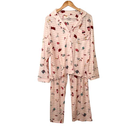 Bring playful charm to your nighttime routine with this NWT Kate Spade New York pajama set in size XL, featuring a light pink and white striped base layered with Kate Spade’s signature novelty print illustrations. This dreamy two-piece includes a long-sleeve button front top and full-length matching pants, designed for those who love cozy chic comfort with a stylish, whimsical twist.