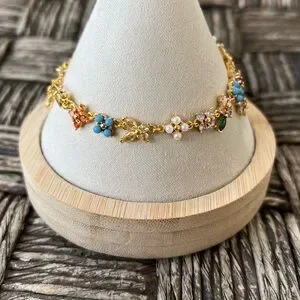 Delicate gold-tone bracelet with multicolor floral crystals. Features pink, purple, blue, red, green and gold accents for a vibrant look. Designed to brighten everyday and special occasion outfits. Lightweight and adjustable for a comfortable fit.