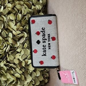 NWT Kate Spade New York apple fabric wallet with leather trim. Wallet has a pocket on the outside, zip pocket inside,12 credit card slots, and lots of room.