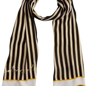 A timeless oblong striped scarf is finished off with a gilded signature and delicate fringe trim. 30"W x 80"L 100% viscose.