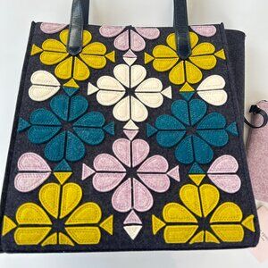 kate spade tote, floral tote bag, felt tote bag, removable wristlet, designer tote bag, large tote bag, professional tote, pink wristlet, floral design bag, everyday handbag, multicolor handbag, kate spade purse, leather strap tote, holiday, gift, birthday, Mother’s Day, Valentine’s Day, event, interview, girls weekend, date night, party, event, girls weekend, summer, winter, fall, spring