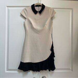 A frilly color-blocked ruffle caresses one side of a whimsical stretch-woven crepe dress tailored with a trim, flattering fit and topped with a face-framing contrast collar.