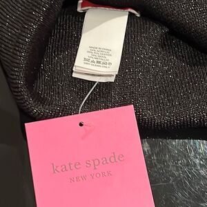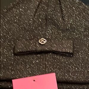 Metallic fibers add eye-catching shimmer to this knit beanie featuring a bow adorned with a subtle metallic logo for signature charm.
