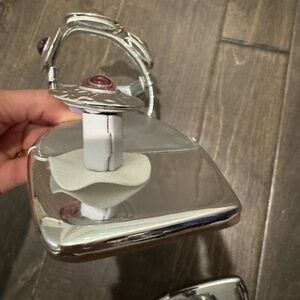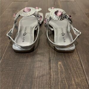 Brand new with tags Katy Perry Camie Silver Slide Sandals in size 8.5M. These sandals feature a shiny silver finish with pink gemstone and hammered metal accents for a fun, glam touch. Beautiful statement piece for vacations, beach dinners, resort wear, or adding a little sparkle to everyday outfits.