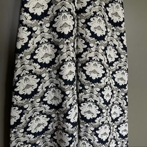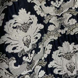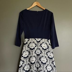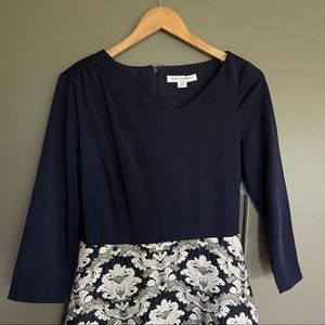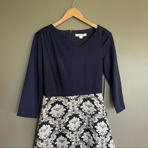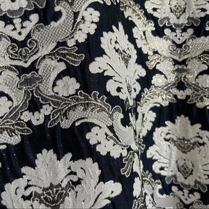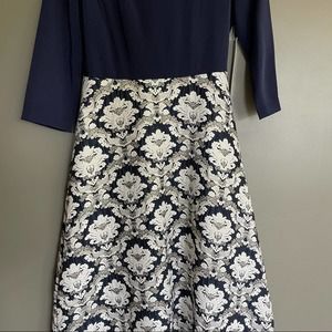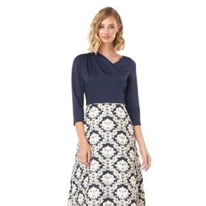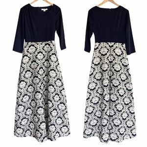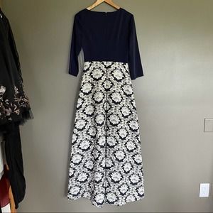 Kay Unger New York Izabella ball gown with stretch faille bodice and jacquard skirt. Asymmetrical neckline. Three-quarter sleeves. Side slip pockets. A-line silhouette. Floor-length. Hidden center back zip. Polyester/metallic. Partially lined. This timeless and sophisticated gown is fashioned with a sleek stretch faille bodice over an opulent brocade skirt to catch the light at every turn. Navy blue top with navy blue ivory and metallic gold jacquard embroidered skirt. Special Occasion, Formal