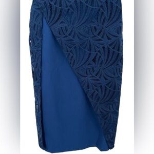 Sweet and sophisticated for a special occasion, this cap-sleeve sheath is crafted from intricate lace and designed with a dipped back. The Zelda Lace Midi Dress In Marine Blue With Lace Design is a staple for every woman's closet